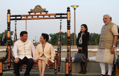 Chinese President Xi Jinping and his wife Peng Liyuan play a swing during the visit in the western Indian city of Ahmedabad in Prime Minister Narendra Modi's home state of Gujarat on Sept 17, 2014.