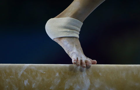 A Chinese gymnast practices on a balance beam during a practice session for the artistic gymnastics competition at the Namdong Gymnasium Club for the 17th Asian Games in Incheon September 18, 2014.