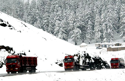 Vehicles move slowly on a snow-covered road in Hami, northwest China's Xinjiang Uygur Autonomous Region, Sept. 12, 2014.