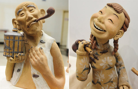 Visitors enjoy pottery figurines at the Shungeng International Exhibition Center in Jinan of Shandong province, Aug 31, 2014. The figurines are created by art master Si Shusheng.
