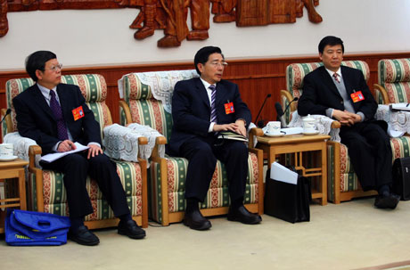 參加人代會的代表們在會上討論政府工作報告。(火炎 攝)