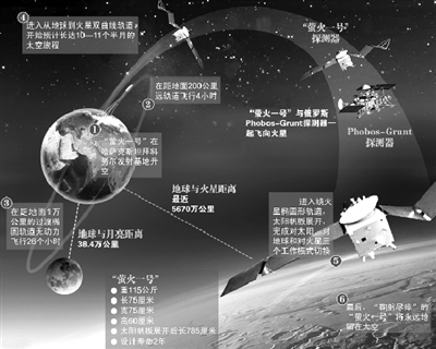 據(jù)俄羅斯聯(lián)邦航天署發(fā)布的消息,將“螢火一號”和“福布斯-土壤”送入太空的是俄羅斯“天頂-2SB”運載火箭。按計劃,火箭發(fā)射升空688秒后,“福布斯-土壤”探測器與“天頂-2SB”運載火箭的第二級脫離。安裝在“福布斯-土壤”探測器上的主發(fā)動機(jī)將在此后啟動,并通過3次點火將兩個探測器送入飛往火星的軌道。全部飛行過程將歷時300天左右。到達(dá)火星后,“螢火一號”將與“福布斯-土壤”探測器分道揚(yáng)鑣,開始自主飛行,開展我國首次火星探測。