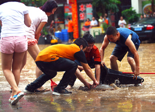 暴雨襲擊廣東東莞 市民街頭抓魚