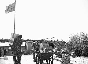 “蝴蝶”風災過后,三沙晉卿島漁民與駐島官兵全力開展災后重建工作。圖為10月5日,島上兵民在搬運救災物資?! ∮浾?黃暢學攝