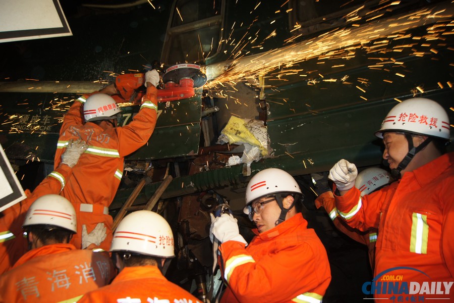 英文《中國(guó)日?qǐng)?bào)》10月25日頭版:2013年10月23日晚,一列在青藏鐵路格爾木站停留的空客車車底溜逸與旅客列車發(fā)生相撞事故,救援人員試圖割開(kāi)受損的車廂營(yíng)救被困旅客。此次事故造成1名旅客遇難。 來(lái)源:中國(guó)日?qǐng)?bào)亞洲新聞圖片網(wǎng) (王秀云 攝)