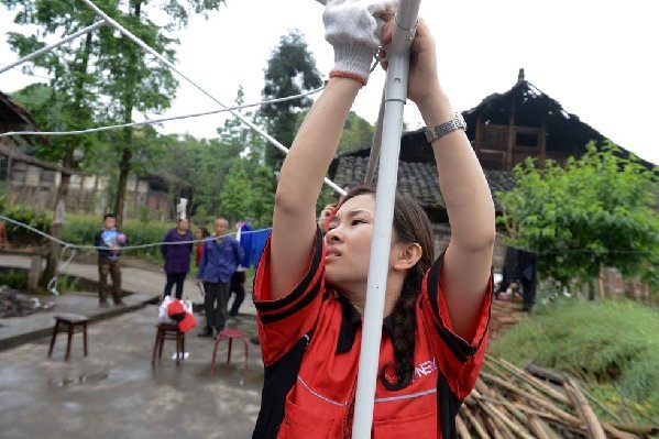 廖智,她是綿竹漢旺鎮(zhèn)的一名舞蹈老師。512地震中,她失去了婆婆和女兒,失去了雙腿。但災(zāi)難并沒有擊垮她,她戴著假肢依舊舞蹈。雅安地震后,她奔赴搶險救災(zāi)一線,戴著假肢送糧、送衣、送發(fā)電機、搭帳篷。圖為廖智幫災(zāi)民搭帳篷。攝影:蒲東峰