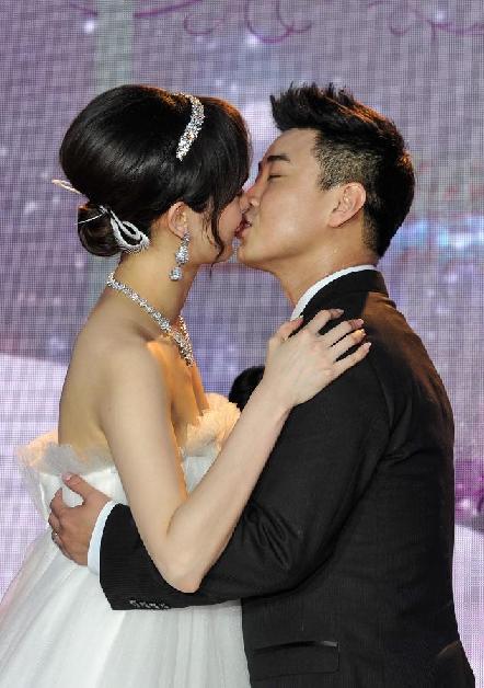 6月29日,王皓(右)與閆博雅在婚禮現(xiàn)場(chǎng)親吻。當(dāng)日,中國(guó)乒壇名將王皓在家鄉(xiāng)長(zhǎng)春與總政歌舞團(tuán)舞蹈演員閆博雅舉行婚禮。新華社記者王昊飛攝