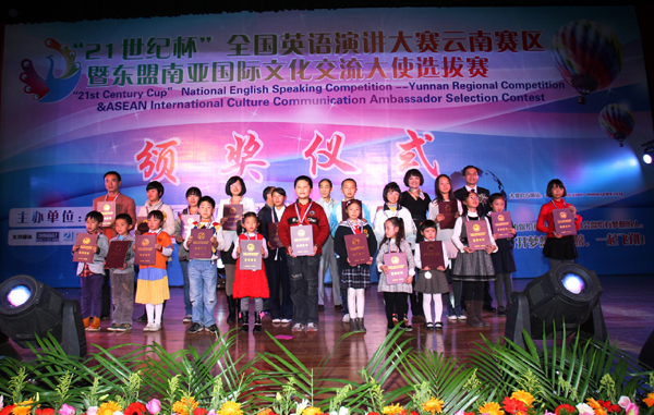 由中國日?qǐng)?bào)社、云南省教育廳共同舉辦的“21世紀(jì)杯”全國英語演講大賽云南賽區(qū)暨東盟南亞國際文化交流大使選拔賽”于2012年4月正式啟動(dòng),歷時(shí)7個(gè)月。共有120所學(xué)校的8305名選手參與了選拔。競(jìng)賽分外語、漢語、藝術(shù)三大類別。經(jīng)過初賽、復(fù)賽、決賽層層選拔,最后,688名選手獲得星級(jí)大使稱號(hào),118名教師獲得優(yōu)秀指導(dǎo)獎(jiǎng),13所學(xué)校獲得特色校園獎(jiǎng),25個(gè)單位獲得優(yōu)秀組織獎(jiǎng)。