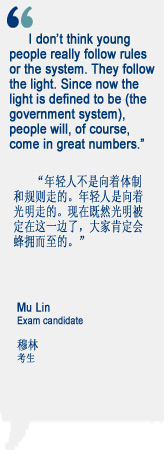 Mu Lin: I don't think this is young people's problem. Young people are just guided to walk toward that direction. They choose whichever path that's bright. In China, perhaps the government system is the bright path, so young people automatically choose it. I don’t think young people really follow rules or the system. They follow the light. Since now the light is defined to be (the government system), people will, of course, come in great numbers.