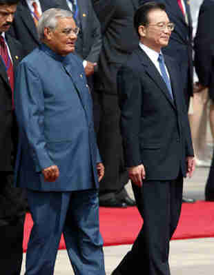 Indian Prime Minister Atal Behari Vajpayee (left), accompanied by Chinese Premier Wen Jiabao, reviews a guard of honour during a welcoming ceremony at the Great Hall of the People in Beijing Monday. Vajpayee is on a 6-day visit to China. [newsphoto.com.cn]