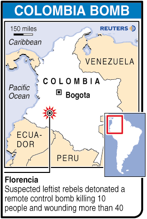 The attack was a blow to President Alvaro Uribe's efforts to rein in indiscriminate violence in a four-decade guerrilla war that kills thousands of people every year.