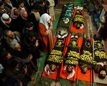 Mourners stand over the bodies of six Palestinians killed in the clashes. Islamic Jihad vowed to avenge the killing of its gunmen. Hamas said the "aggression is a greeting and a reception for the American delegation." Wolf and Satterfield urged Qorei to meet soon with Israeli Prime Minister Ariel Sharon. Qorei has balked at a summit until he gets assurances it will produce results. Also, he was hoping to present Sharon with a Palestinian agreement for a truce, but he has been unable to secure a deal. "We told them, 'OK, help in the preparation for the meeting,"' Qorei told reporters afterward. "If there is a successful meeting, a meeting with good indications for our people, we are ready." The United States has promoted the road map, which envisions the formation of a Palestinian state in 2005.