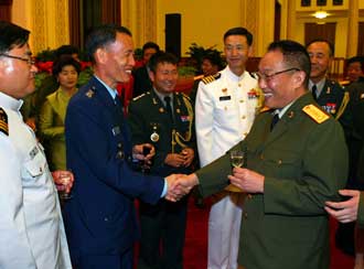 | | | | | | | | | | | | |  | | | The picture shows the SUPER-7 fighter jet, which is the first fighter jet completely designed and manufactured by China. The third-generation fighter plane, which can carry 3.8 tons of missiles, also has improved systems for attacking ground targets. Its advanced radar positioning and operating systems give the plane greater flexibility and better close-range manoeuvrability. [sina.com.cn] | | | | | | | | | | | | |  | | | Chinese Defence Minister General Cao Gangchuan (Left) toasts with Walter F.Ballen Pena (Right), military attache of Peru Embassy in China, in a reception held yesterday at the Great Hall of the People in Beijing by the Ministry of Defence, to celebrate the 76th anniversary of the founding of the Chinese People's Liberation Army (PLA), which falls on August 1. [newsphtoto.com.cn] | | | | | | | | | | | | |  | | | Militias take part in shooting exercise in Yuanling, Central China's Hunan Province on June 19, 2003. Local authorities are taking all kinds of measures to enhance the fighting capabilities of the militias. [newsphoto.com.cn]