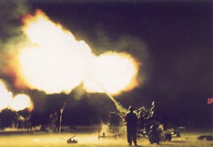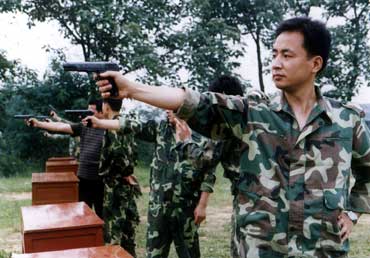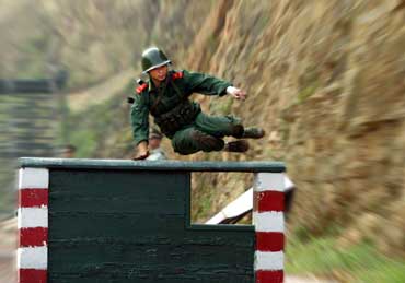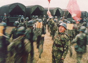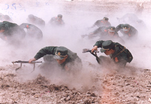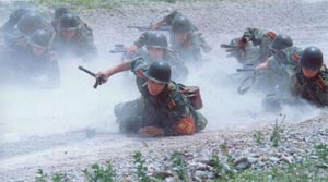 | | | | | | | | | | | | |  | | | A soldier from the Zhejiang Unit of the Armed Police jumps over a wall in an anti-terror exercise in Hangzhou, East China's Zhejiang Province on July 9, 2003. [newsphoto.com.cn] | | | | | | | | | | | | |  | | | Chinese peacekeepers wait for march order in Beijing Capital International Airport on April 1, 2003. They are heading for the Democratic Republic of Congo for a peacekeeping mission. [newsphoto.com.cn] | | | | | | | | | | | | |  | | | A bomb left over by the Japanese invaders in the 1930s was detonated by soldiers stationed in Xia'men, East China's Fujian Province on April 3, 2003. [newsphoto.com.cn] | | | | | | | | | | | | |  | | | In its field maneuver, an antiaircraft artillery regiment of the Beijing Military Area Command actively explores new methods of hitting targets at night and during long-range raid. The picture shows the regiment conducting firing practice at night. [pladaily] | | | | | | | | | | | | |  | | | Soldiers from a reconnaissance training group of the Jinan Military Area Command run the "enemy's blockade line" in their graduation examination . In order to improve their cadets' overall quality, the group pays much attention to setting up teaching subjects close to actual combat. [PLA Daily] | | | | | | | | | | | | |  | | | Liu Chunlin (R), a doctor with the Shenyan Military Area Command, and Li Mingrui receive people's greetings during a group wedding ceremony for eight newlyweds on July 1, 2003, in Dalian, Northeast China's Liaoning Province. The eight couples postponed their marriage to help Beijing's fight against SARS in Xiaotangshan hospital. [newsphoto.com.cn]
