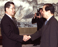 Former Taiwan "Premier" Vincent Siew (left) meets Chinese Vice-Premier Qian Qichen at the Zhongnanhai leadership compound in Beijing May 11. Siew arrived in Beijing on Tuesday to try to win mainland leaders over to his idea of establishing a regional common market as part of reconciliation efforts. [Reuters] |