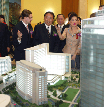 Designers introduce a model of China Central Place. The complex, which will involve an investment of 8 billion yuan (US$960 million), is one of Beijing's major projects to enhance its international status. It will include more than 230,000 square meters of office space, eight residential towers, 160,000 square meters of retail shopping space and a large park and sports centre. [newsphoto]