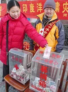 Bombarded with devastating TV pictures on tsunami-ravaged South and Southeast Asian countries and a rising death toll, Zhou Jin, 78, an average Chinese in Beijing, rushed to a local donation center Saturday and left 1,800 yuan (about US$217). "I am too old to have much expenditure. Here is the cash I have with me. Take it and make use of it for the needy there," Zhou told civil affair officer Zhang Ye.