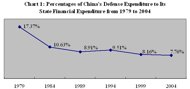 China has always put emphasis on the control of its defense expenditure scale. The defense spending is appropriately allocated under the guideline of coordinated development of national defense and economy. Since the adoption of the reform and opening-up policies, the Chinese government has kept its defense expenditure under strict control in order to concentrate its strength on economic development. From 1979 to 2004, the percentages of China's defense expenditure to its financial expenditure of the same period followed a downward curve on the whole. It was 17.37% in 1979, and 7.76% in 2004, down by about 10 percentage points.