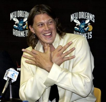Hornets' Chris Andersen, known as 'Birdman,' flashes his bird sign after