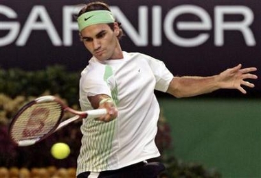 Switzerland hits a return against Marcos Baghdatis of Cyprus during the