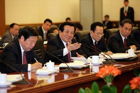Vice-President Zeng Qinghong (Left Second) talks as he joins the Tianjin delegation in panel discussion March 6, 2006. [Xinhua]