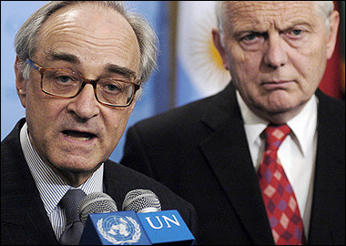 Representative to the UN Jean-Marc de La Sabliere speaks to the press as