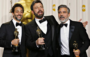 Best picture winner "Argo" producers George Clooney, Grant Heslov and Ben Afleck pose with their awards at the 85th Academy Awards in Hollywood.