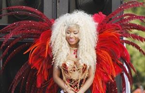 Trinidad-born hip hop artist Nicki Minaj performs during the filming of a carnival-themed music video for her song Pound the Alarm, in Belmont, July 4, 2012.