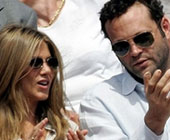 Jennifer Aniston watches a men's final match between Spain's Rafael Nadal and Switzerland's Roger Federer during the French Open tennis tournament at the Roland Garros stadium in Paris.
