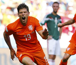 2014年6月30日,巴西卡斯特朗體育場,2014巴西世界杯1/8決賽,荷蘭2-1絕殺墨西哥。后腰德容開場不久因傷下場。下半場,多斯桑托斯遠射破門。