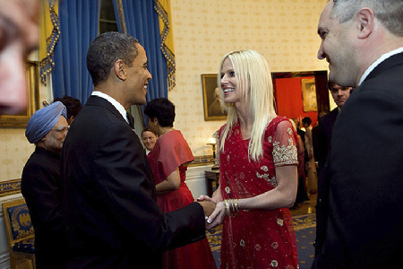 照片顯示,薩拉希夫婦走進了白宮的“藍色房間”,這里是總統(tǒng)會見貴賓的主要場所。一臉興奮的米夏埃爾雙手握住奧巴馬伸來的一只手,嘴里在說些什么,塔里克則在一邊微笑著傾聽,美國總統(tǒng)露出了燦爛的笑容,似乎跟這對“冒牌客人”聊得很高興。站在奧巴馬左側(cè)的印度總理辛格看上去好像正在偷瞄身邊這位穿著大紅色印度裙裝“紗麗”的異國金發(fā)美女。