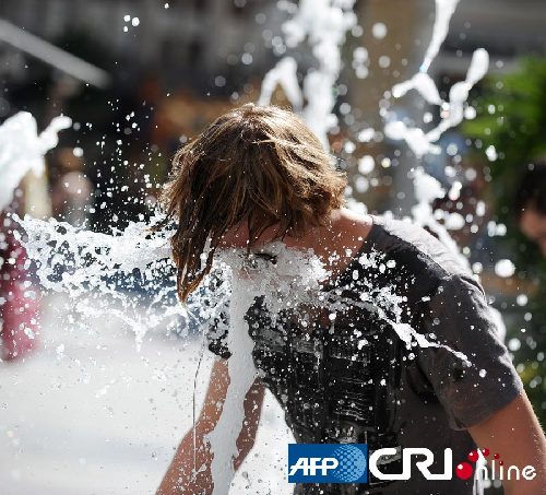 1、18歲的卡塞·耶魯將臉對著噴泉沖洗,感受泉水的清涼。當天,氣象臺顯示氣溫達到45攝氏度,成為洛杉磯歷史上最熱的一天。(AFP/國際在線)