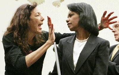 中國日報網(wǎng)環(huán)球在線消息:美國國務(wù)卿賴斯10月24日前往國會山參加聽證會時與一名反戰(zhàn)示威者狹路相逢,示威者在她面前揮舞染成血紅色的雙手進(jìn)行抗議,并且稱她為“戰(zhàn)犯”。