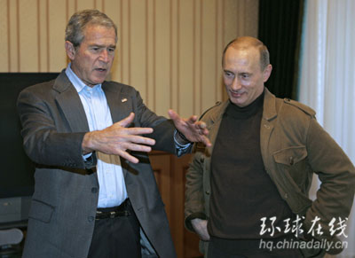 俄羅斯總統(tǒng)普京(右)與布什交談。[英國媒體圖片]