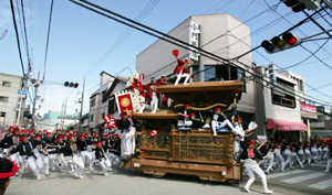 2007年9月16日,在日本大阪府的岸和田市,人們拉著花車在街道上穿行。花車祭是大阪附近一項民間活動,成百上千的人們抬著數(shù)噸重的花車奮勇前行、穿越街道。這一活動在當(dāng)?shù)赜?00余年的歷史了。 新華社/法新