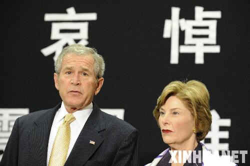 5月20日,美國(guó)總統(tǒng)布什和夫人勞拉來(lái)到位于華盛頓的中國(guó)駐美國(guó)大使館吊唁中國(guó)四川汶川大地震遇難者。 新華社記者張巖攝