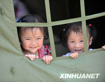 6月1日,王琪琪(左)、王倩小朋友從帳篷里向外探望。