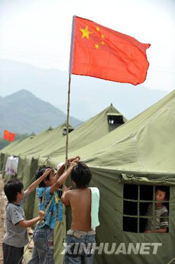 6月1日,青川縣竹園鎮(zhèn)漁水村安置點(diǎn)的孩子們在帳篷外掛國旗。