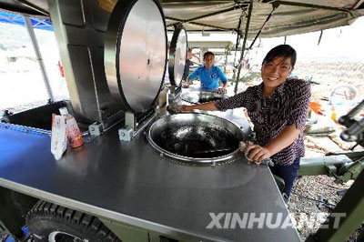 6月1日,青川縣房石鎮(zhèn)新須村賈清蓮(右)等村民在漁水村安置點(diǎn)清潔部隊(duì)提供的野營炊事車。