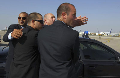 據(jù)英國《每日電訊報》報道,當(dāng)天,以色列總理奧爾默特和總統(tǒng)佩雷斯在本·古里安機場舉行儀式歡送法國總統(tǒng)薩科齊及夫人一行。正當(dāng)軍樂隊表演時,距薩科齊僅100米處突然響起槍聲,以為發(fā)生恐怖襲擊的以方和法方的安全人員迅速作出反應(yīng),立即護送薩科齊和夫人布呂尼登上飛機,奧爾默特在保鏢的護送下登上一輛防彈車,佩雷斯也被護送上另一輛車,現(xiàn)場頓時陷入一片混亂之中。