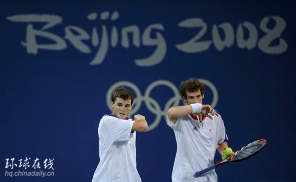 英國(guó)網(wǎng)球選手穆雷兄弟在男雙第一輪比賽中