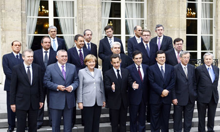 10月12日,法國總統(tǒng)薩科齊(前排左四)、總理菲永(前排右四)、歐盟委員會(huì)主席巴羅佐(前排右三)、歐元集團(tuán)主席盧森堡首相容克(前排右二)和歐洲中央銀行行長特里謝(前排右一)等歐元區(qū)首腦在峰會(huì)前合影。當(dāng)天,歐元區(qū)15國首腦在巴黎召開有史以來的首次峰會(huì),尋求為共同應(yīng)對(duì)當(dāng)前愈演愈烈的金融危機(jī)而采取聯(lián)合行動(dòng)。