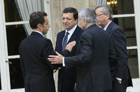 法國總統(tǒng)薩科齊(左一)與歐盟委員會(huì)主席巴羅佐(右二)、歐元集團(tuán)主席盧森堡首相容克(右一)和歐洲中央銀行行長特里謝交談。