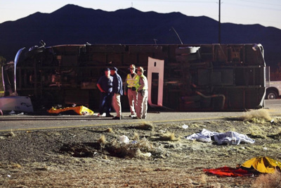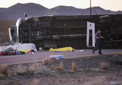 事故大約發(fā)生在當(dāng)?shù)貢r(shí)間30日下午4時(shí),客車(chē)在93號(hào)高速公路上向北行駛時(shí)突然失控,先是向左沖然后向右拐,并沖過(guò)了中間的隔離帶,在至少翻滾了一圈后才完全停下來(lái),最后傾覆在南向車(chē)道上,車(chē)頭嚴(yán)重受損。事發(fā)地點(diǎn)距離著名的胡佛水壩約40多公里,距離著名賭城內(nèi)華達(dá)州拉斯維加斯市約100公里。