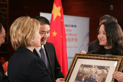 美國國務(wù)卿希拉里接受中國日?qǐng)?bào)贈(zèng)送的禮物