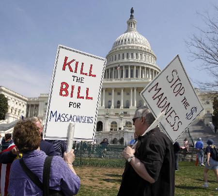 有抗議者在國會山外舉著標語牌要求議員斃掉醫(yī)改方案