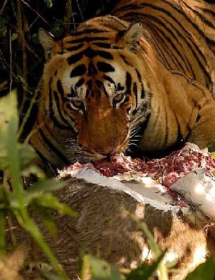 資料圖:孟加拉虎在撕咬獵物(圖片來自網(wǎng)絡(luò))