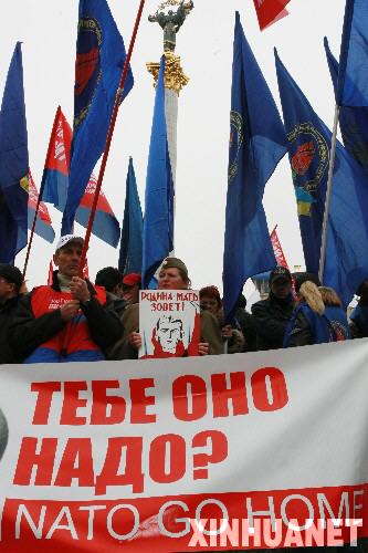3月31日,在烏克蘭首都基輔,抗議者揮舞旗幟、手舉標語參加集會。當日,在美國總統(tǒng)布什到訪前,烏克蘭左翼黨派在基輔市中心舉行大規(guī)模群眾集會,反對烏克蘭加入北約。新華社記者宋宗利攝