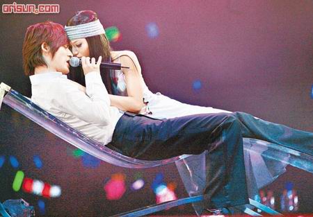 2006》演唱會前晚圓滿結(jié)束,首場因?yàn)橛信研煳蹑拢ù骃)監(jiān)場關(guān)系,周渝民(仔仔)與女舞蹈員點(diǎn)到即止,熱吻時(shí)只以手遮掩借位,怎料大S前晚返臺灣出席妹妹婚宴,他立即作反與女舞蹈員真吻,認(rèn)真大膽!