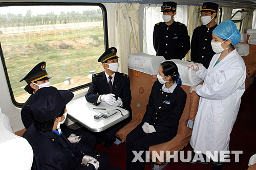 2003年5月29日,北京至濟(jì)南T35次列車(chē)臨時(shí)黨支部成員在研究預(yù)防非典在列車(chē)上傳播的方案。T35次列車(chē)臨時(shí)黨支部成員在抗擊非典一線辛勤工作,關(guān)鍵時(shí)刻把危險(xiǎn)留給自己,把安全讓給群眾。